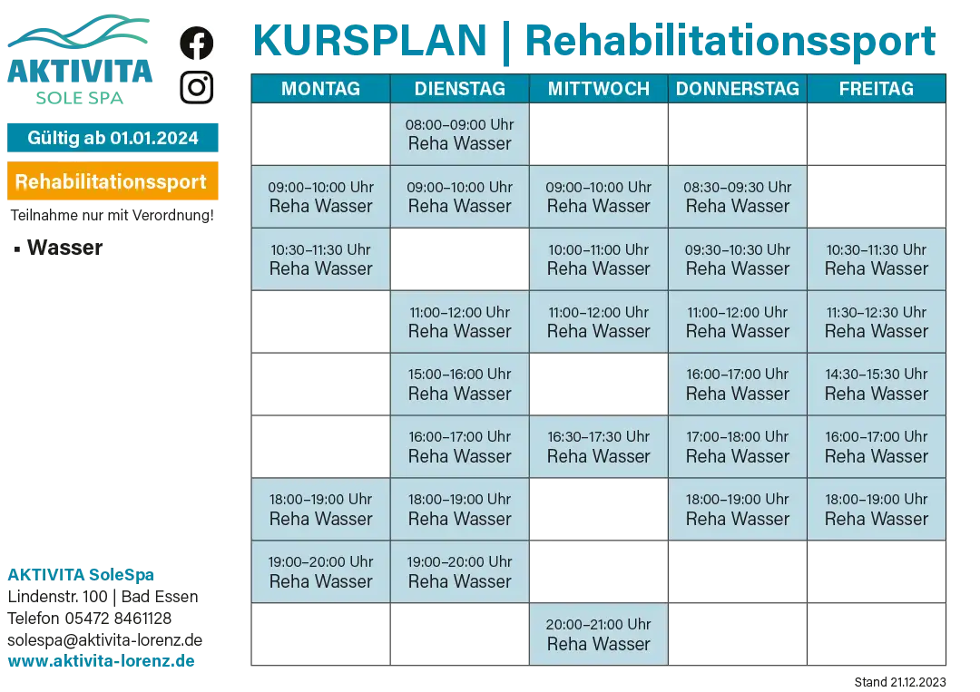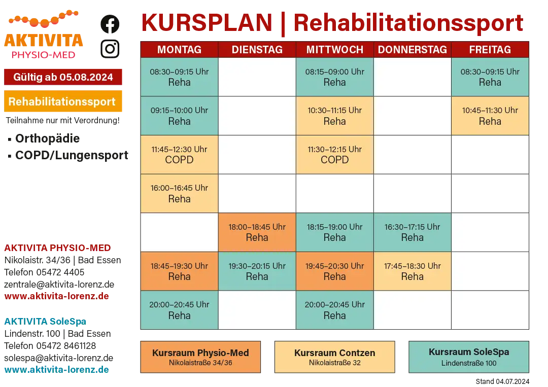 Mit einem breiten Angebot an Rehasport und Funktionstraining unterstützt der Verein Menschen dabei, ihre körperliche Fitness zu verbessern und ihre Gesundheit zu erhalten. Sowohl für Trocken- und Wassergymnastik werden regelmäßige Übungsstunden von Montag bis Freitag angeboten.